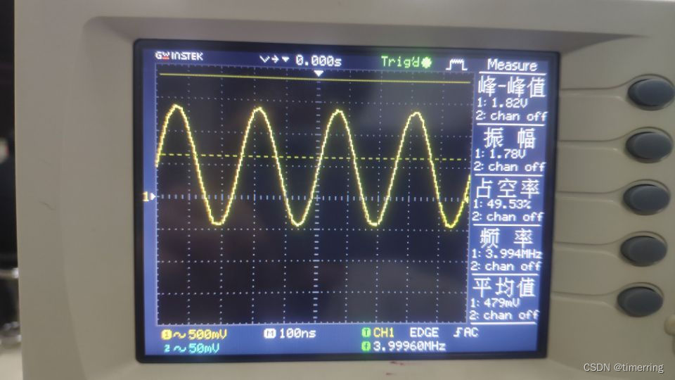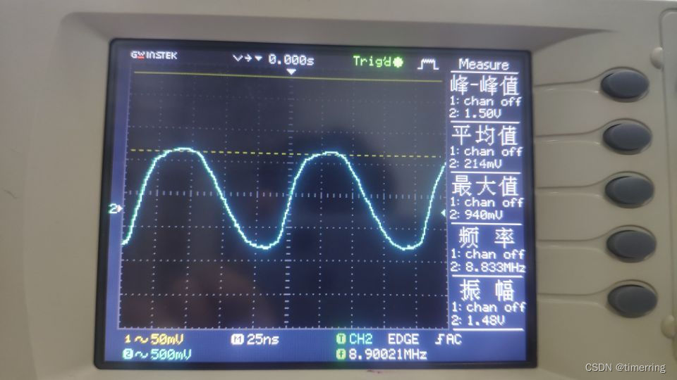 ,当Ct不断增大,导致整体值在不断变小,因此对应的中心频率f0也在不断变小。此外,也动手实现了调频波的输出,验证了公式