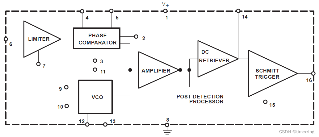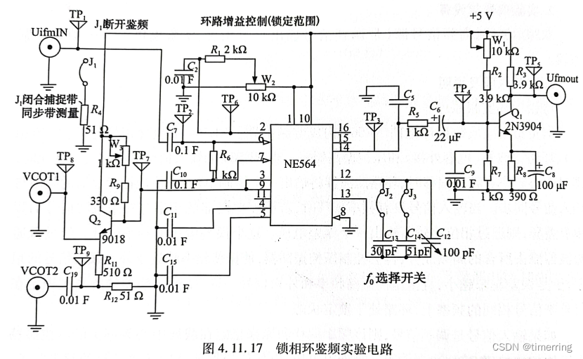本实验用集成锁相环路 NE564构成调频电路。NE564中包含一个压控振器,NE564的音频信号由输入端12INO1输人低频信号后,在 NE564的输出端将会产生调频波,该调频波是近似于TTL电平的方波。