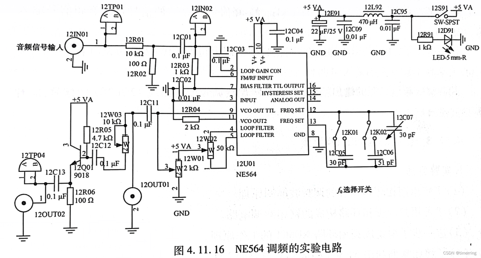 NE564调频的实验电路如图4.11.16所示。其中选择开关12K01、12KO2用来切换压控振荡器外接的电容值C,从而改变压控振荡器回路的振荡频率,即载波信号频率