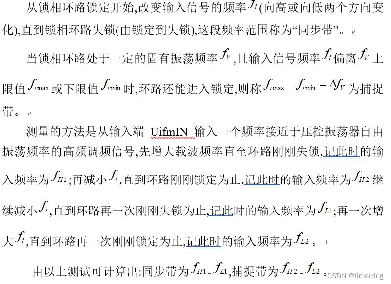 再把高频信号源的输出频率调整在同步带以外,即该锁相环电路已对输入信号失锁,然后慢慢地增加或降低高频信号源的输出频率,当检测环的输出频率跟踪输入时,即该锁相环实验电路已锁定,其测得的频率范围就是捕捉带。