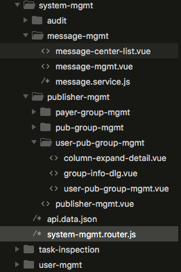 系统管理在UI上是一个一级菜单,下面会有三个二级菜单,包括审计,消息管理和发布者管理。所以直接映射到源代码结构就是system-mgmt目录下有三个二级目录。其中消息管理下面直接是相应的组件以及服务,而发布者管理下面又进行了一次划分,因为这个功能有三个tab,每一个tab又对应一层目录,最后目录下面才是相应的组件以及服务。
