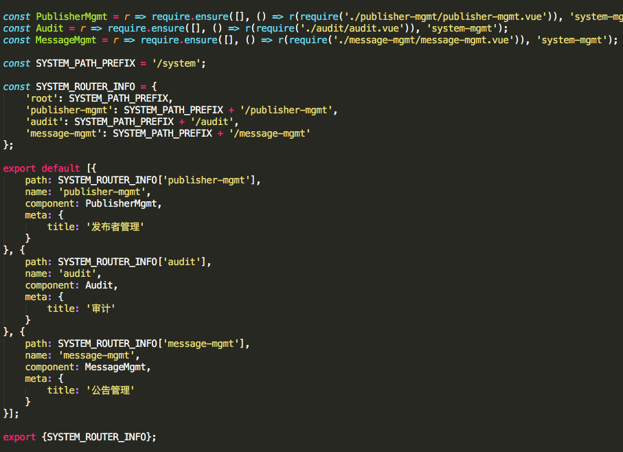 原则上每一个一级菜单对应一个路由配置,路由里面的所有组件全部用require.ensure动态加载,比如system-mgmt.router.js