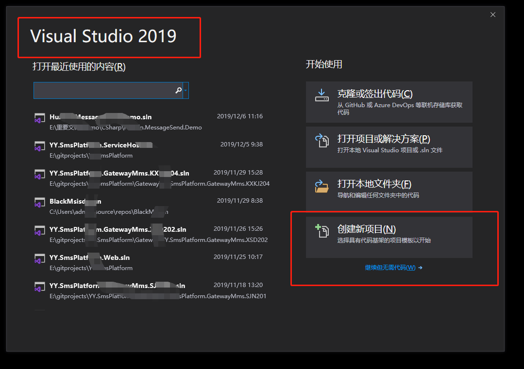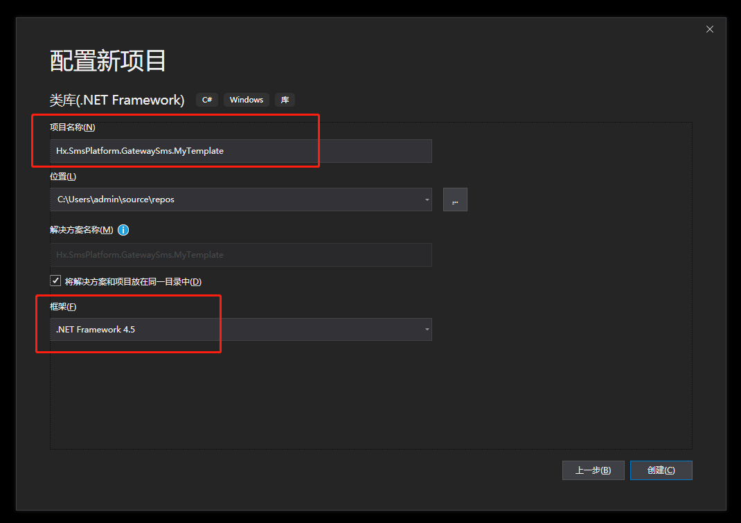 - 打开vs2019,创建类库项目,并输入项目名称。(选择.Net Framework4.5框架,语言:C#)