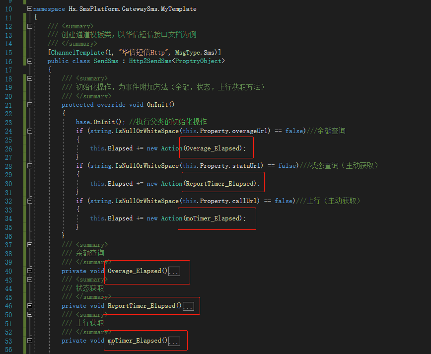 6.重写父类SendSms的 OnInit方法,并执行父类的初始化操作,然后为事件附加相应的方法,用于余额,状态和上行的获取,如图: