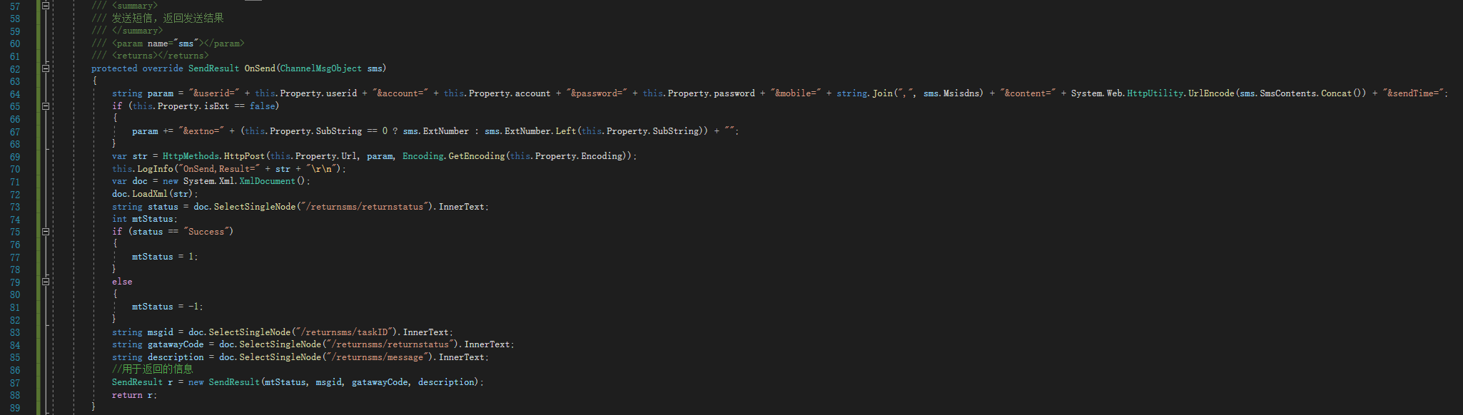 7. 重写父类Http2SendSms<>的OnSend方法,在此方法中,编写远程调用逻辑,并获取返回值,进行解析,生成SendResult类返回。