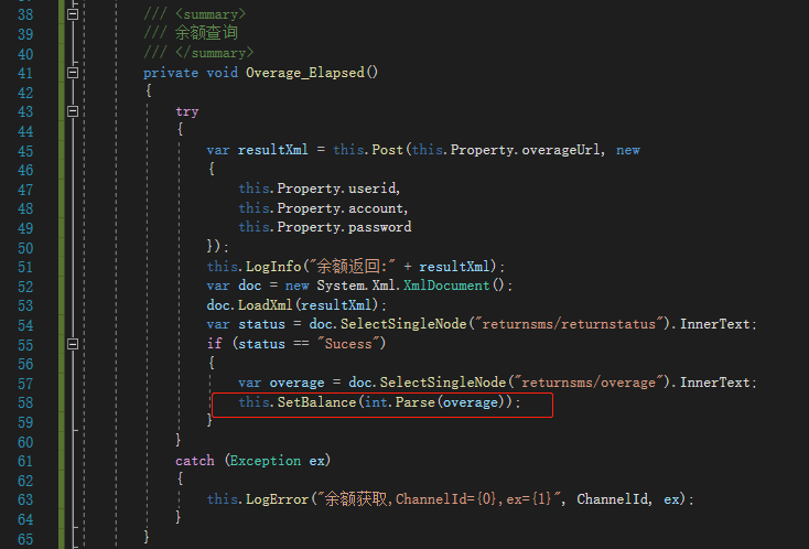 8.余额获取,为事件Elapsed(30秒执行一次)附加方法Balance_Elapsed,执行余额查询的相关逻辑操作,使用SetBalance方法设置当前通道余额,如图