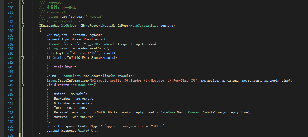 该接口用于在需要通道方推送上行时。SendSms类继承该接口,并实现OnPost方法。