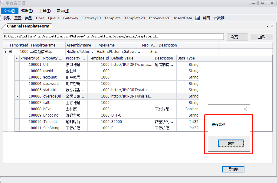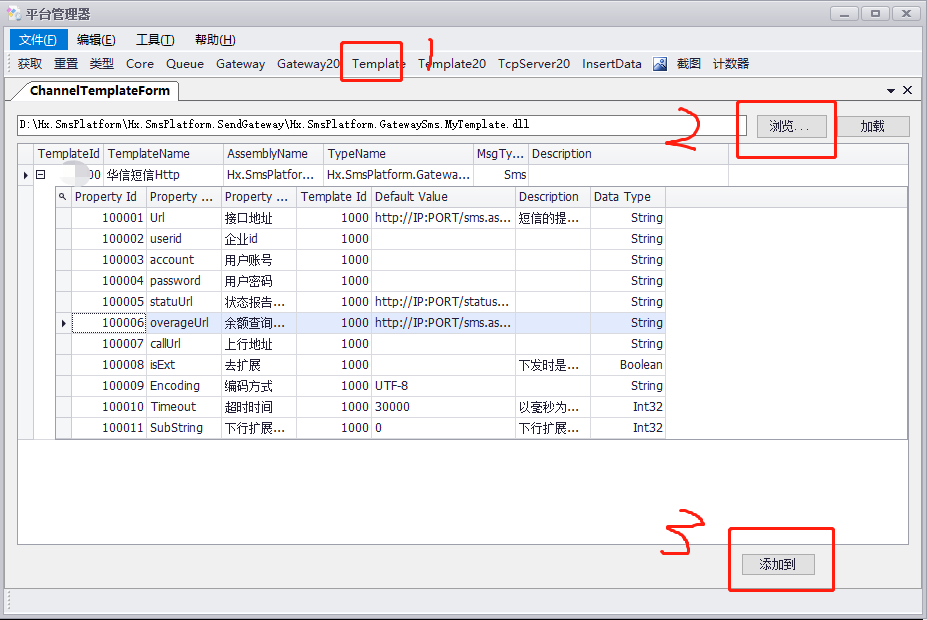 11.将生成的程序集文件放到Hx.SmsPlatform.SendGateway文件夹下,如果状态或者上行有需要推送的,将程序集文件在Hx.SmsPlatform.ReceiveMoReport网站的bin目录下,放一份该模板的程序集文件。然后使用Hx.SmsPlatform.WindowsForms程序的TemPlate窗口,将通道模板注册到程序中,