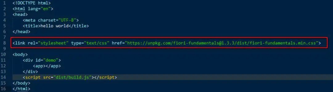 最后一步,在index.html 里引入位于CDN上的Fiori Fundamentals的css文件。当然github上也提到了也可以使用 npm install --save fiori-fundamentals 将其安装到本地使用。