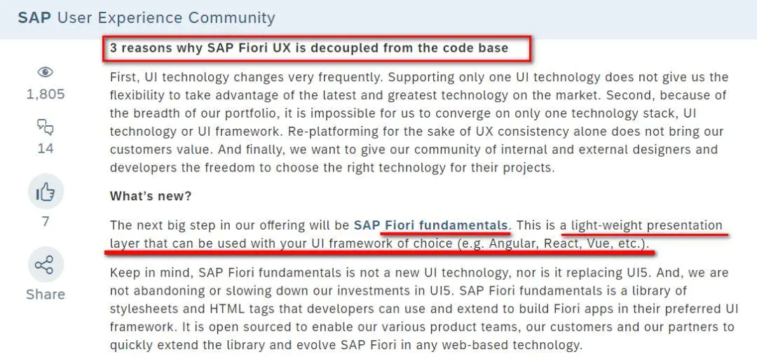 我们都知道 Fiori 代表 SAP 新一代 UI 的界面风格,而 UI5 是 Fiori UX(User Experience,用户体验)的具体实现技术。从下图这则新闻 能够看出,SAP 决定将 Fiori 同具体 UI 实现技术解耦, 是出于什么考虑呢?