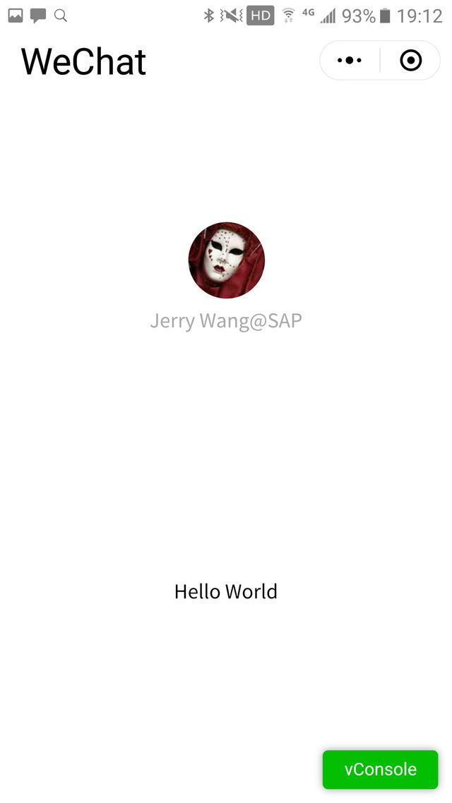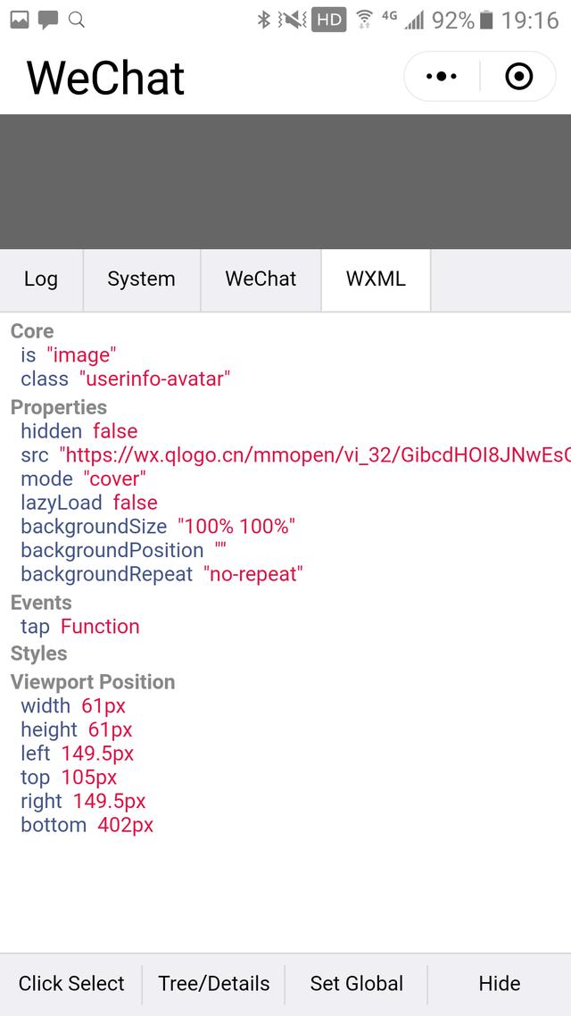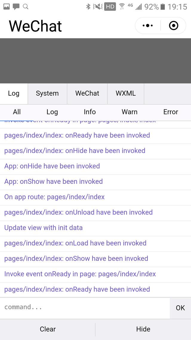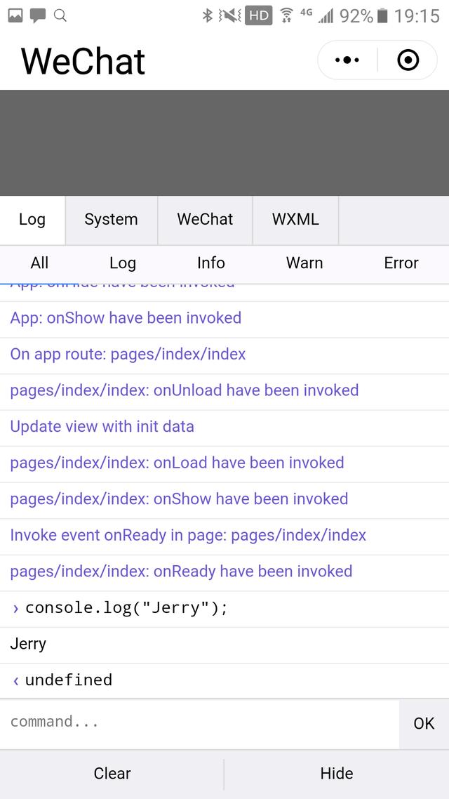 接着整个手机屏幕就被微信小程序的调试器充满了。这个调试器和电脑上安装的微信开发者工具相比,仅仅能显示日志和执行一些简单的JavaScript操作,但是不能像电脑上那样,进行JavaScript代码的调试。