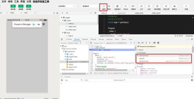 点击“编译”按钮,我们的小程序自动启动,设置在控制器里的断点就自动触发了。这样我们就可以通过单步调试的方式来学习微信小程序控制器的调用上下文了。