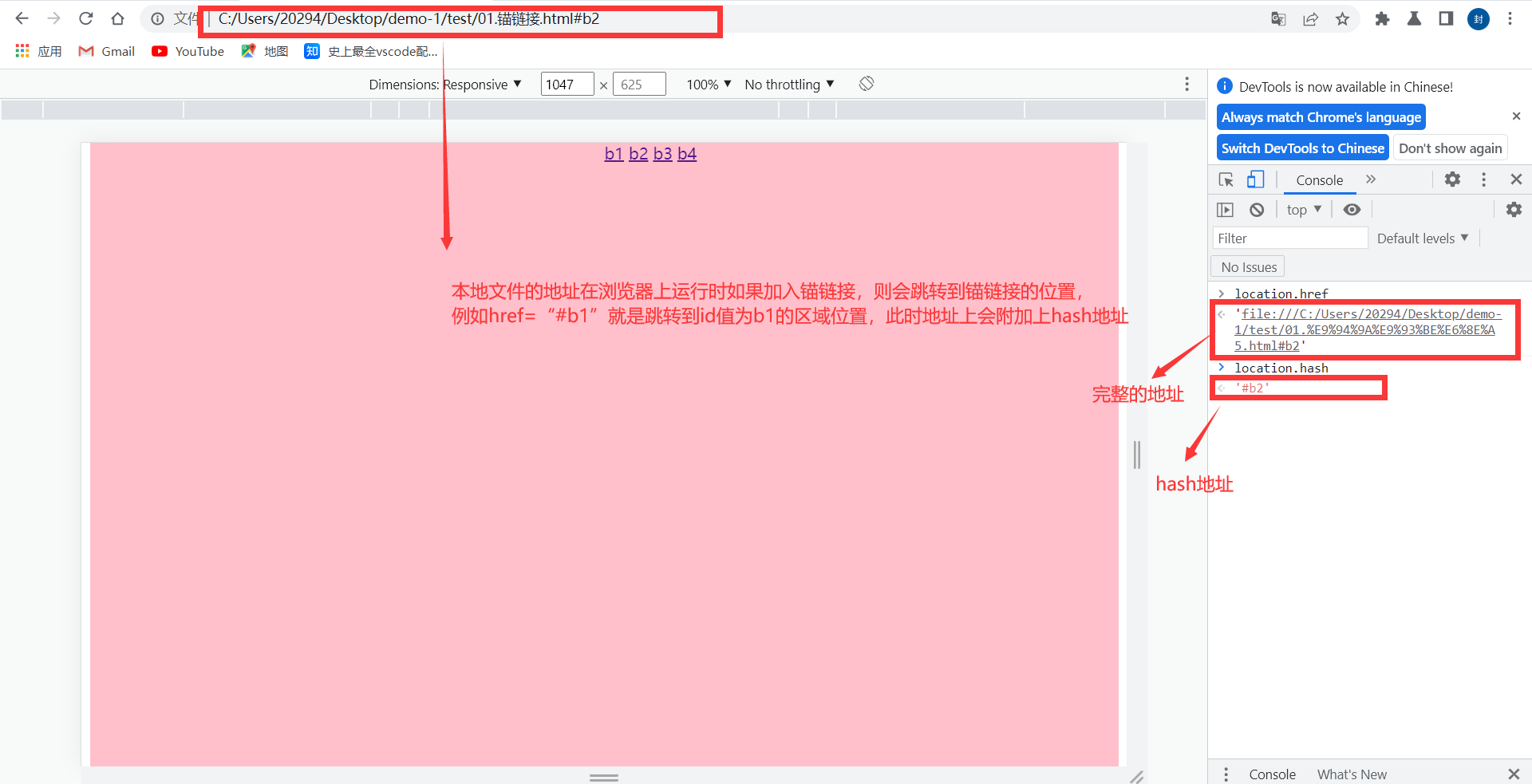 注意:本地文件的地址在浏览器上运行时如果加入锚链接,则会跳转到锚链接的位置,