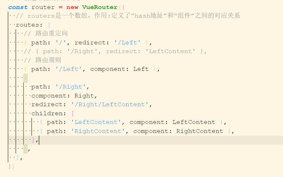 路由重定向指的是:用户在访问地址A的时候,强制用户跳转到地址C,从而展示特定的组件页面。通过路由规则的redirect属性,指定一个新的路由地址,可以很方便地设置路由的重定向: