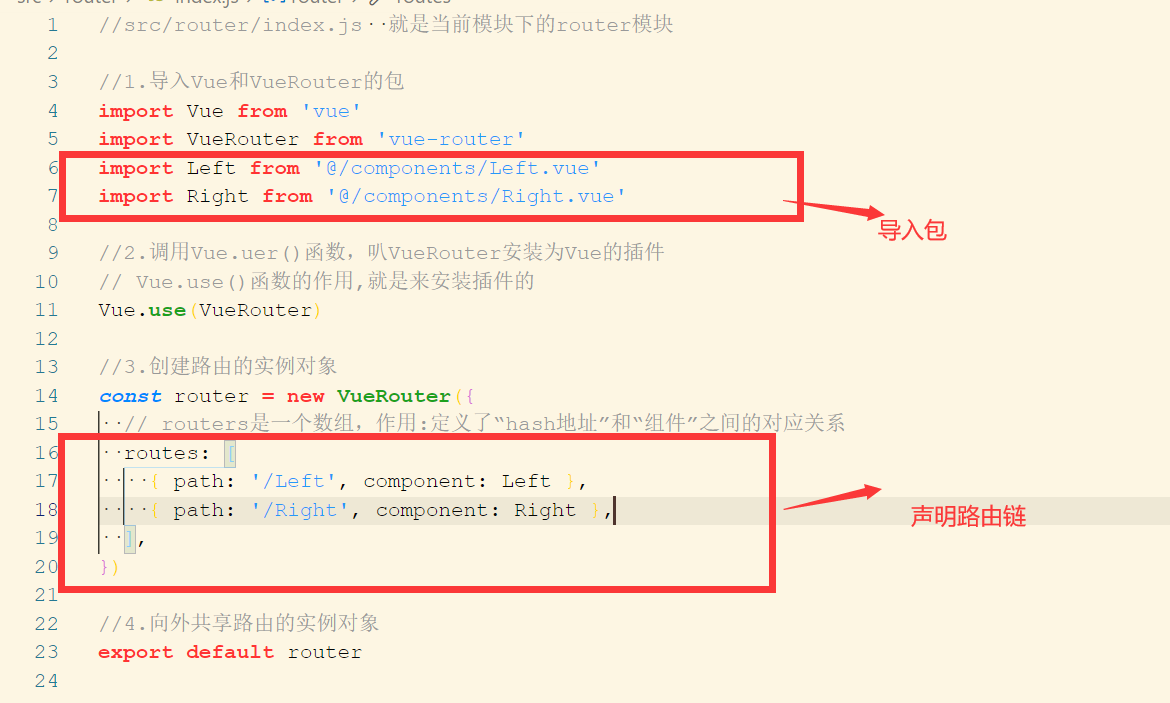 // 在Vue项目中,要想把路由用起来,必须把路由实例对象,通过下面的方式进行挂载