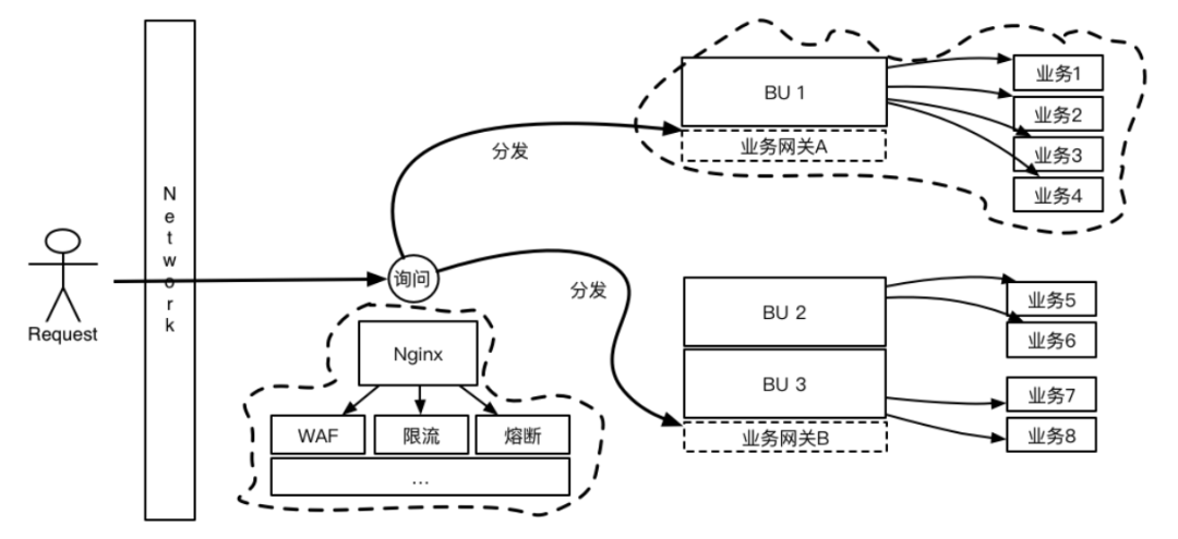 那不同业务线的业务网关可以是一个么?这个答案需要结合背后业务线的复杂程度来回答。业务网关扮演的角色除了稳定承接的业务线流量,更好服务用户(Request)外,还担负着业务线话事人的角色。什么样的用户应该享受什么样的服务(鉴权),是与用户一问一答的形式还是一次询问多个需求统一回答(串行/并行分发)。