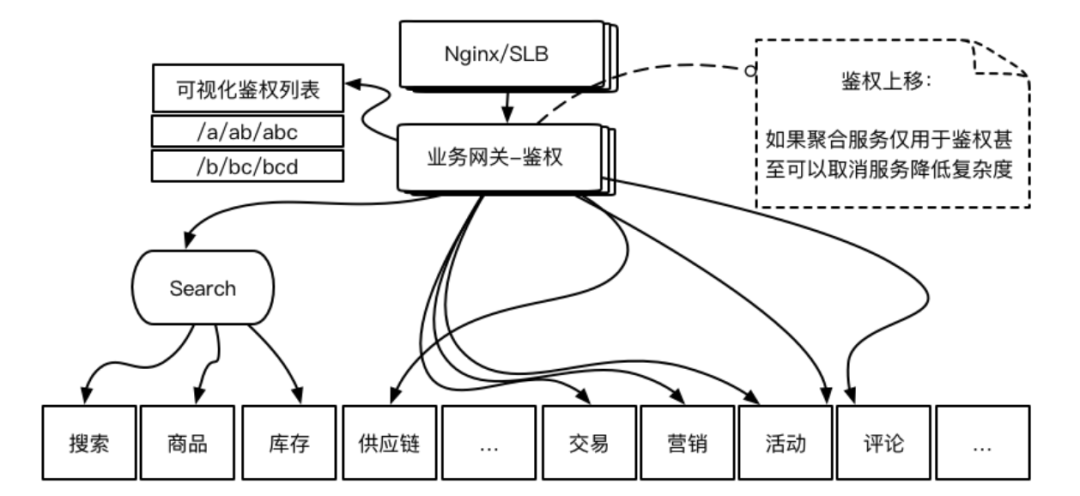 由于上层的 Nginx/SLB 无法承担业务线的鉴权问题,所以通常这类功能通常下移至业务线入口进行(如图中 Search,C 等)。