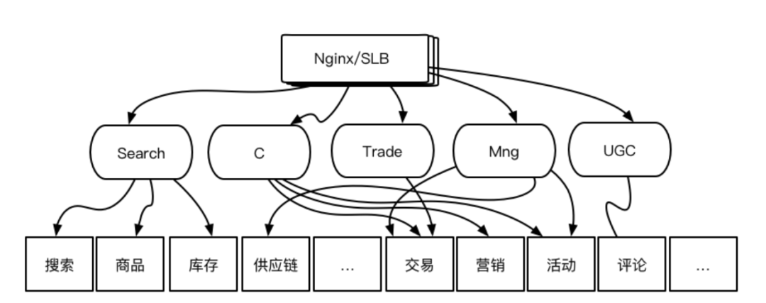 其中 Search,C,Trade,Mng,UGC 等(数量还在不断增加)是按底层业务域粗粒度聚合后服务入口(也可以称之为聚合服务或聚合接口)。这些粗粒度的聚合服务均以独立的 SC 服务形式部署,并分别提供不同业务域的访问鉴权,业务限流,服务编排,数据视图转换等类似能力。与底层业务域通过 Feign Client + Http进行服务交互。