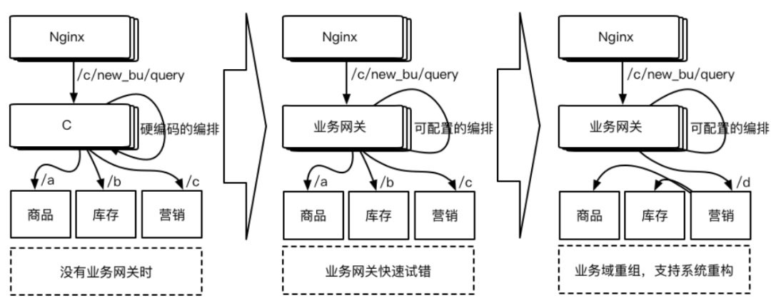 而实现合理的业务网关应该通过合理的请求路由和服务编排将争议暂时上移(至业务网关),支撑研发快速验证,待后续业务边界逐步明朗后低成本甚至零成本重组业务域。业务规模扩大和系统复杂度的增加会造成研发和维护成本急剧上升,这是软件工程学早就得出的结论,而业务网关则可以通过更好的协调上下游合作方,有效提高协作体验,为合作赋能。
