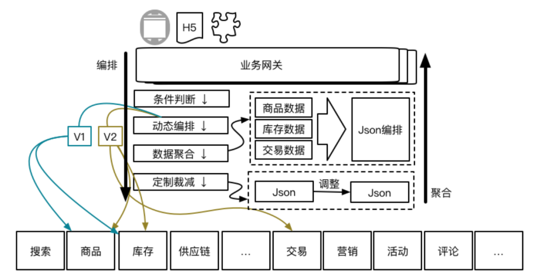 而实现合理的业务网关应该通过透明代理,条件判断,服务编排,服务聚合,数据裁减等一系列能力,在终端与业务服务间建立一座基于配置的桥梁,向上提供兼容数据,向下屏蔽兼容细节。