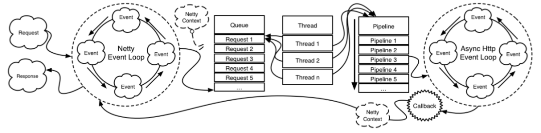 如果 AggregatePipeline 仅需要处理一个请求(比如透明代理),那么将请求委托给 Async Http Client 后将终止后续 Pipeline,将业务线程交还给线程池用以处理后续请求。而当 Async Http Client 触发异步回调时(无论是成功,失败或者超时)均会利用 Async Http Client 异步回调线程向当前请求持有的 Netty 上下文(Netty Context)回写响应,并最终由 Netty 事件处理机制再次通过 IO 线程写入网络。