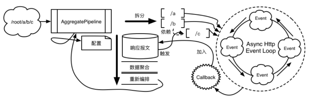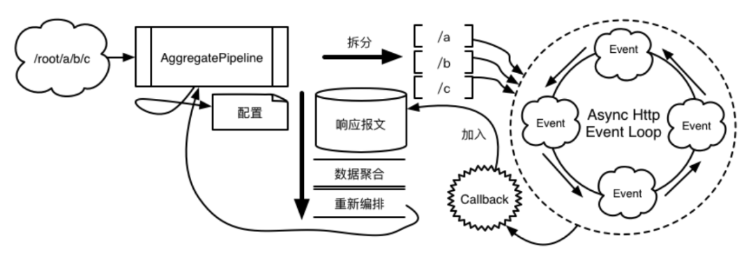 Pipeline 中有个比较特殊的处理器称之为 AggregatePipeline,承担着并行请求路由,响应数据聚合,最终报文重写等一系列重要工作。AggregatePipeline 会根据接口的配置参数拆分若干个并行请求,并通过Async Http Client 异步机制对多个并行请求的响应数据进行后处理(响应数据聚合等)。
