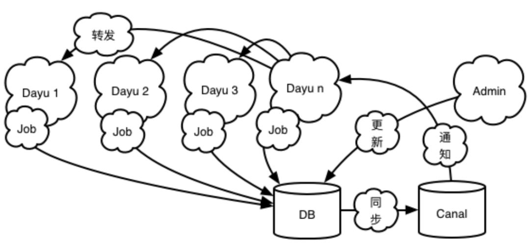 「大禹」会在打开服务端口(接流)前一次性从数据库加载当前所有可用的服务接口Schema至内存中。如果随后接口管理者通过控制台(Admin)新增/更新配置至DB,则通过 Alibaba Canal 监听 Binlog 的方式推送实时变更至任意一台业务网关,而后由该台业务网关再通过内部接口的形式转发扩散至其他节点。