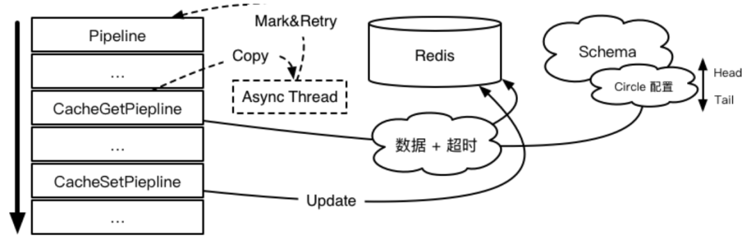 CacheGetPipeline 处理器读取缓存时会利用 Redis Pipeline 同时读取缓存 TTL(Time To Live),并将 TTL 加入至 Ognl 上下文后交由 Schema 进行 Circle 配置的触发判断。