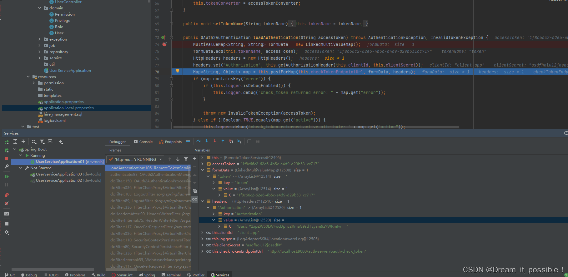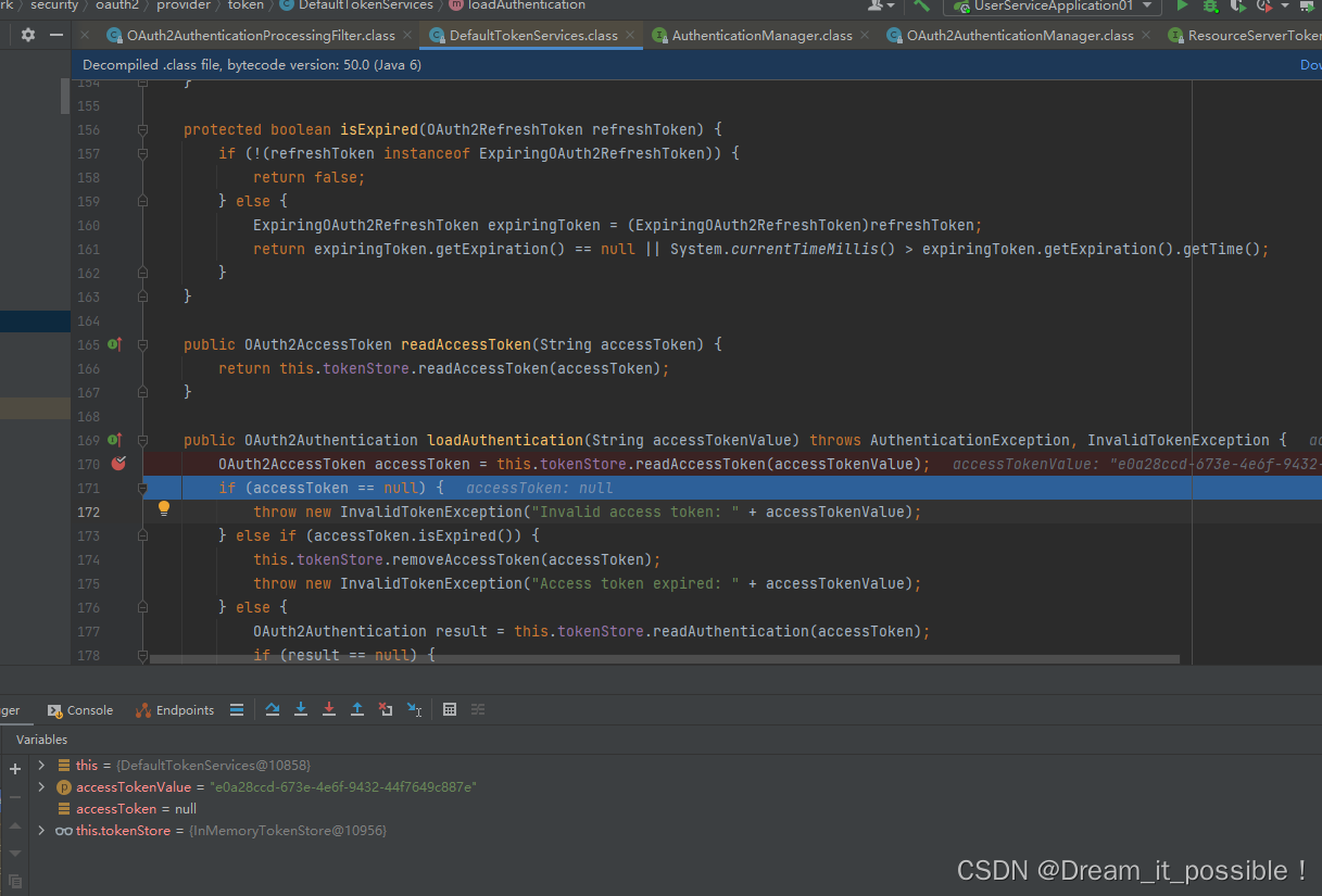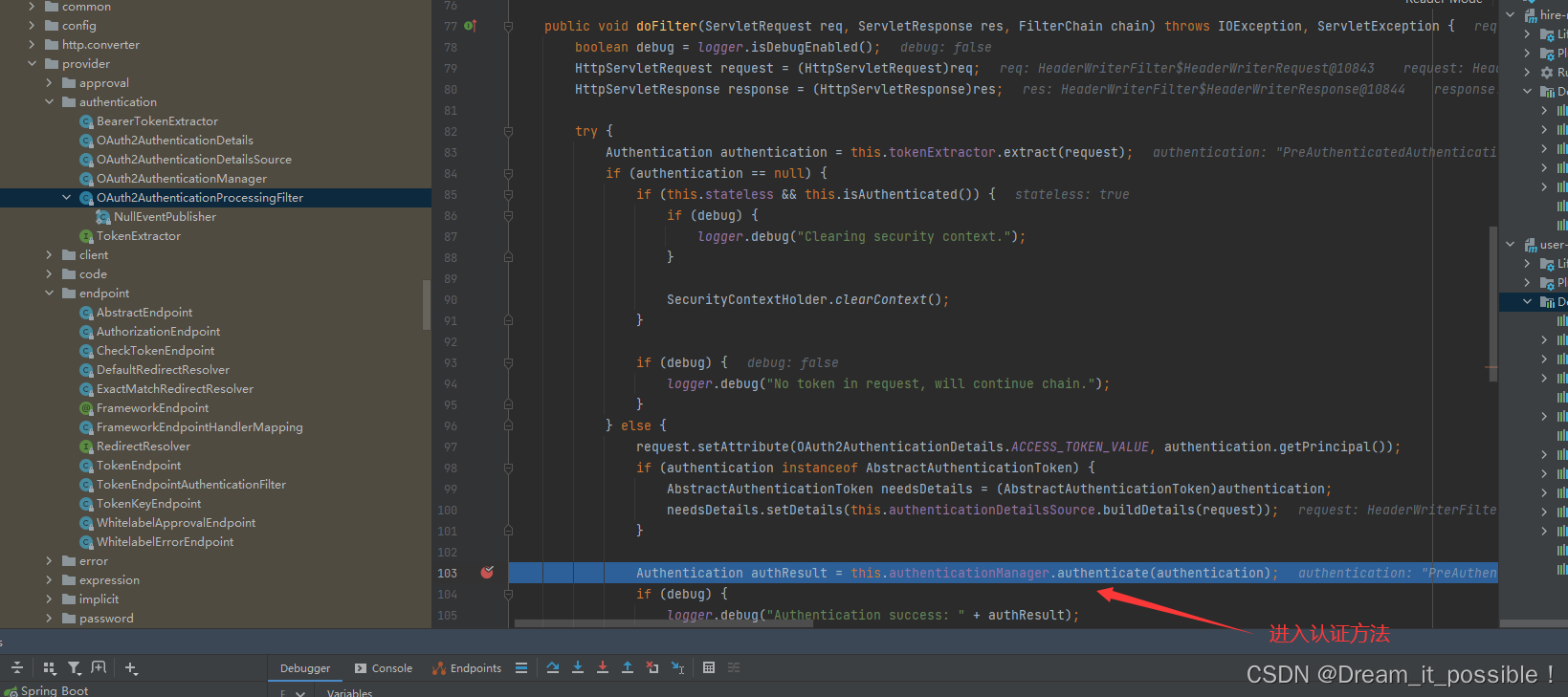 可以发现默认是进入到DefaultTokenService认证token的,我们可以推断出肯定是不行的,因为我在user-service的项目里没有配置授权服务器,简单讲user-service是没有授权功能的。