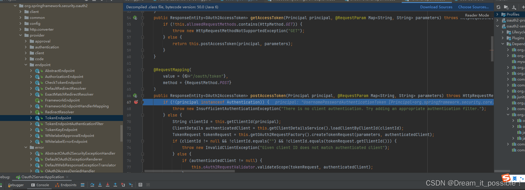 /oauth/token接口在org.springframework.security.oauth2.provider.endpoint里的TokenEndpoint类里, 该接口会以post请求方式对外提供以表单形式的认证方式,通过了就会返回带期限的token。