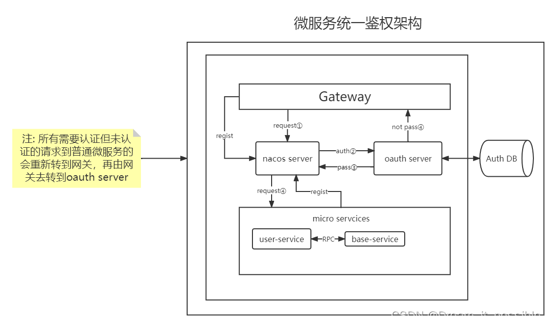 在一个大型的分布式系统里,存在的微服务可能有几十个或者上百个,如何使用网关和oauth server来保护,我们可以将普通微服务的未认证的请求全部由网关转发给鉴权服务器。