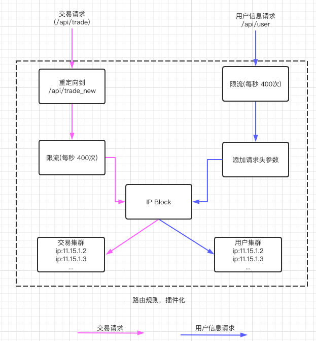 如图示,两个请求对应的路由规则是不一样的,它们对应的路由规则(限流,rewrite)等通过各个规则插件组合在一起,可以看到,光两个请求 url 的路由规则就有挺多的,如果一个系统大到一定程度,url 会有不少,就会有不少规则,这样每个请求的规则就必须「可配置化」,「动态化」,最好能在管理端集中控制,统一下发。