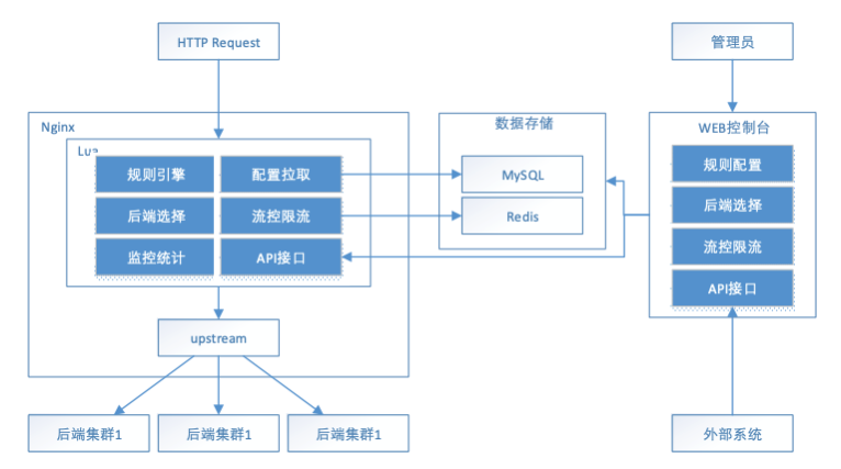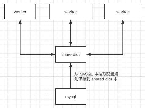 需要注意的是为了避免重复去 MySQL 中拉取数据,某个 worker 从 MySQL 拉取完规则(此步需要加锁,避免所有 worker 都去拉取)或者后端集群等配置信息后要将其保存在 shared dict 中,这样之后所有的 worker 请求只要从 shared dict 中获取这些规则,然后将其映射成对应模块的函数即可,如果配置规则有变动呢,配置后台通过接口通知 OpenResty 重新加载一下即可