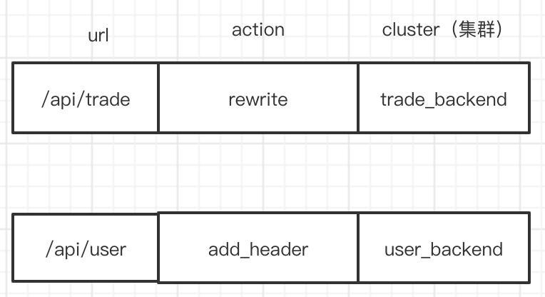 1、每条策略由 url ,action, cluster 等组成,代表请求 url 在打到后端集群过程中最终经历了哪些路由规则,这些规则统一在我们的路由管理平台配置,存在 db 里。