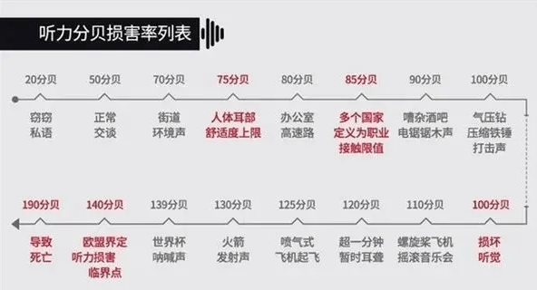 人的耳朵虽可听到各种各样的声音,但只有在一定的频率和强度的声音范围之内,才会使人感觉舒服而且对听力无损害。研究发现,正常人在音量小于分贝的环境中,听力不会受到损害;高于85分贝,耳朵的听觉细胞就会受到损伤。