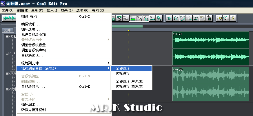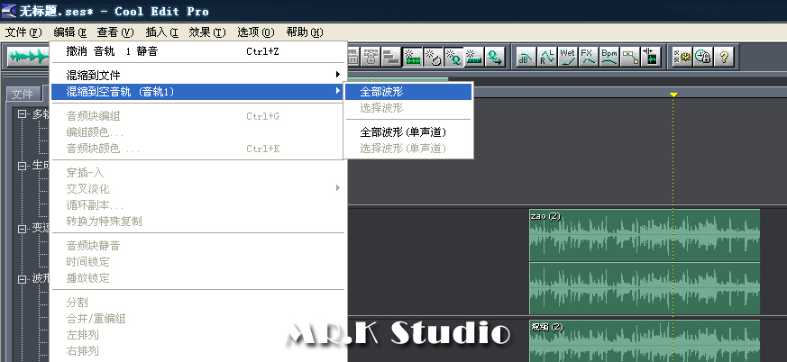 回到多轨界面,删除第1轨的音乐素材,混缩反相后的噪音和嘈杂的音乐两个音轨。