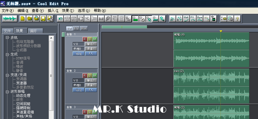 首先我们要制造出嘈杂环境下的音乐。选取两段声音,一段定为要输出的正确的声音,一段定为噪音,然后将它们混音,成为嘈杂的声音。这时候第三个音轨就是1、2两轨的混音了,听一下是嘈杂的音乐。