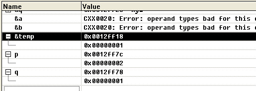 template <typename T> 10 void swap1(T p,T q) 11 { 12 T temp; 13 temp=p; 14 p=q; 15 q=temp; 16 } 17 18 //指针传递,函数体内只有指针值的变化