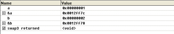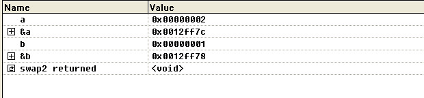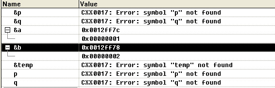 可以看到的是,p和q的地址和a与b的地址不一样,只是把a和b的值拷贝过去了,在swap1中对p和q操作只是对临时分配的栈中内容进行操作,函数执行完后形参就消失了,对原来的a和b不产生任何影响。所以swap1不能完成交换a和b值的功能