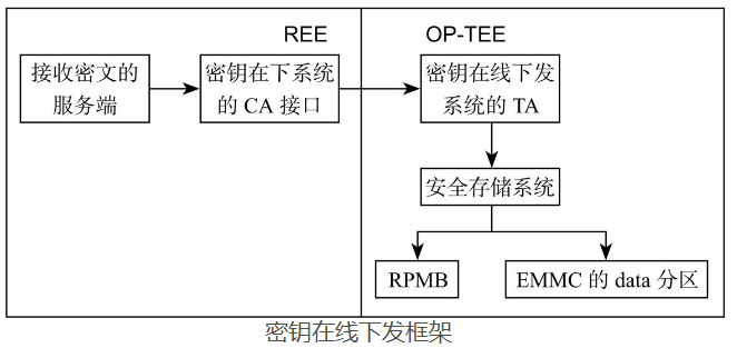 将下发的密文密钥包发送到OP-TEE中,由OP-TEE来完成对密文数据包的解密以及密钥的保存就能确保下发的密钥的安全性,如果在使用该密钥时也将相关加密操作放在OP-TEE中,这样可以确保密钥在任何时候都不被暴露在REE侧,这样可以构建一个安全的通信密文环境。整个终端密钥在线下发系统的框架图如图所示。