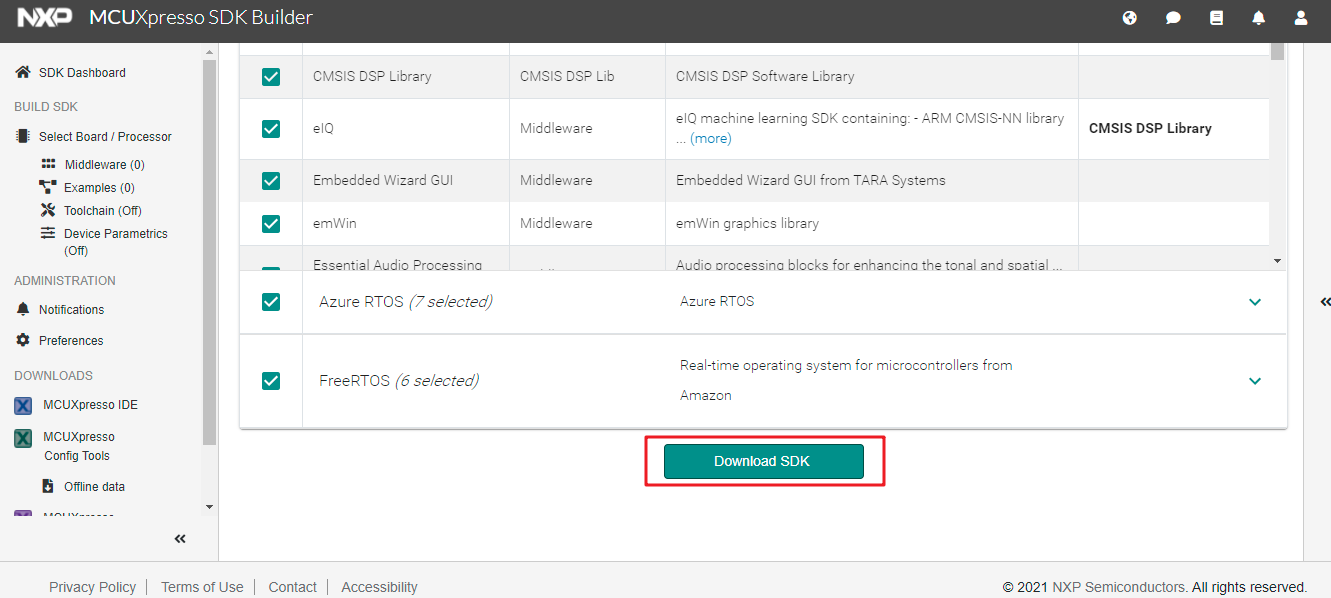 MCUXpresso SDK Builder提供了开源的驱动库、中间件、参考示例等,可以定制和下载针对某款处理器的 SDK。