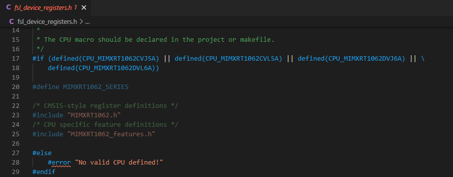 fsl_device_registers.h中是一些预处理文件,用来根据用户定义的CPU类型选择是否包含1062的寄存器定义文件。