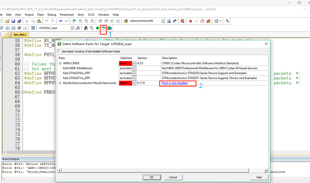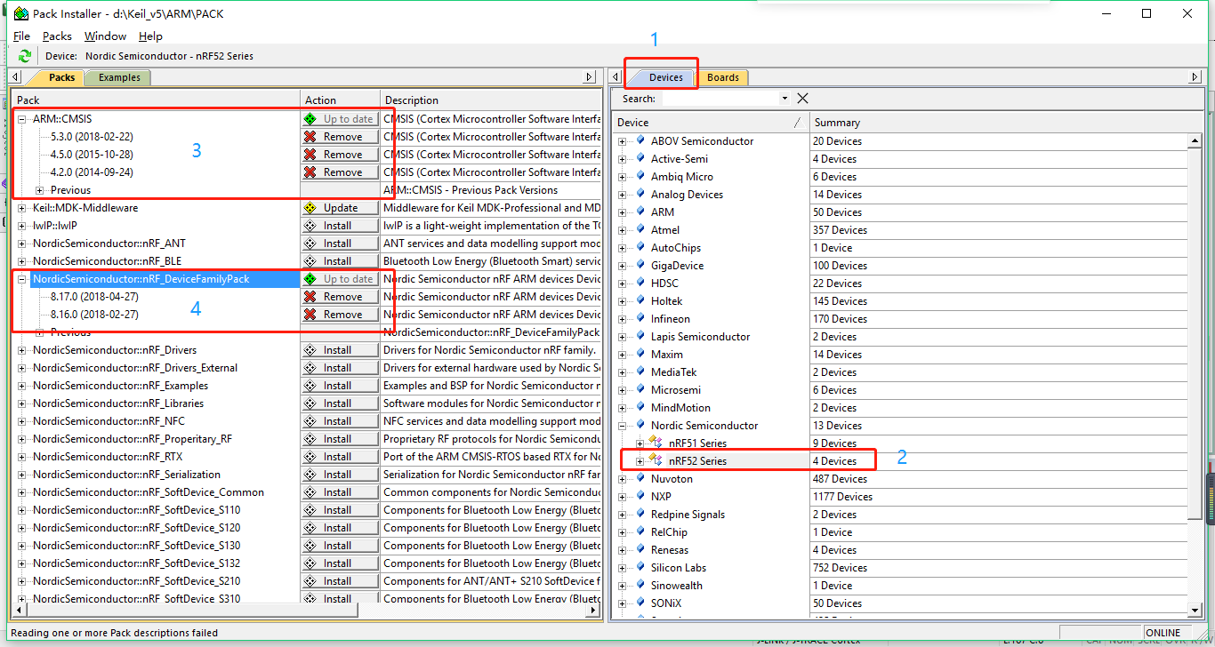 安装arm的内核库和nordic的芯片库的pack,需要联网