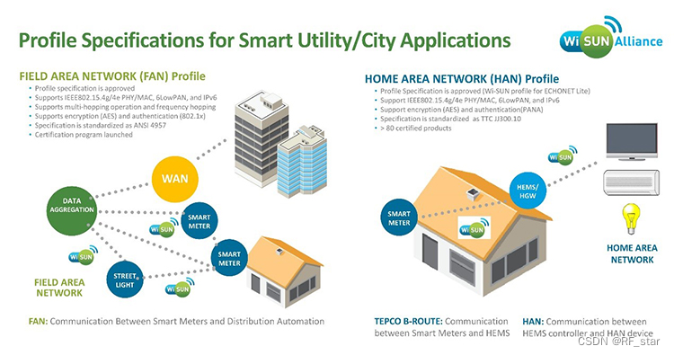 Wi-SUN标准主要包含两个子规范,分别是FAN和HAN,其中技术区别及应用场景分别如下: