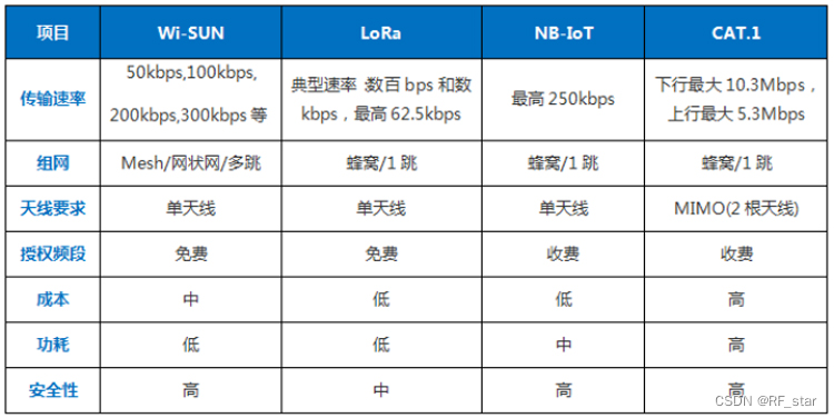 1. Wi-SUN 与LoRa、NB-IoT、CAT.1可以做个全面对比吗?最为关注的是功耗、传输速率、授权(收费)与非授权(免费)、以及安全性方面、成本方面的全方位对比?