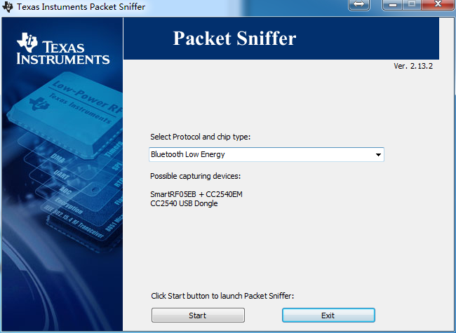 2.打开TI的Packet Sniffer选择Bluetooth Low Energy然后点击Start