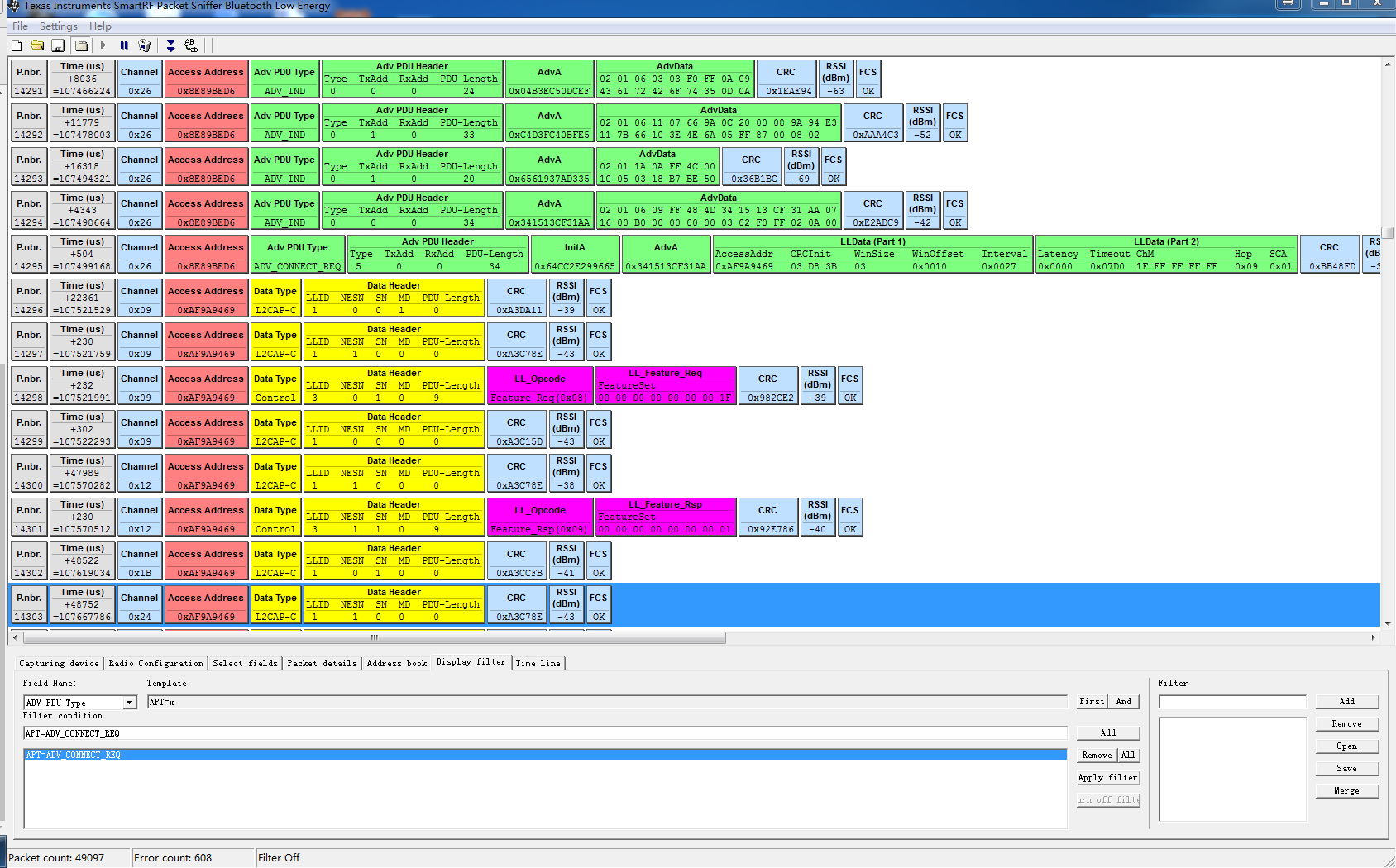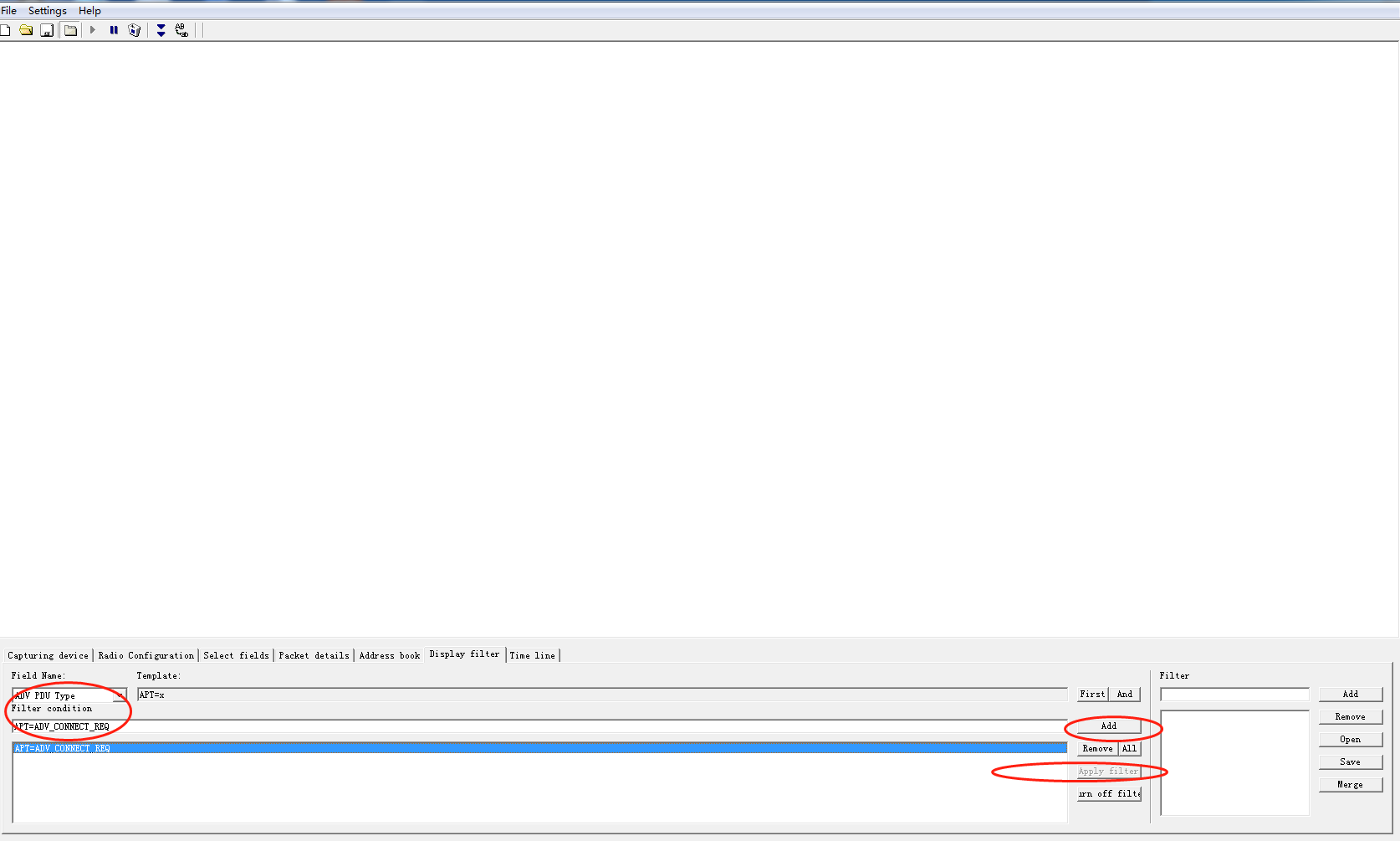 数据包太多都不知道哪个是哪个,怎么办,这时候重要的一步来了,就是点击Display filter 选择ADV_PDU_Type 然后参数为APT=ADV_CONNECT_REQ然后点击Add 之后点击Apply filter