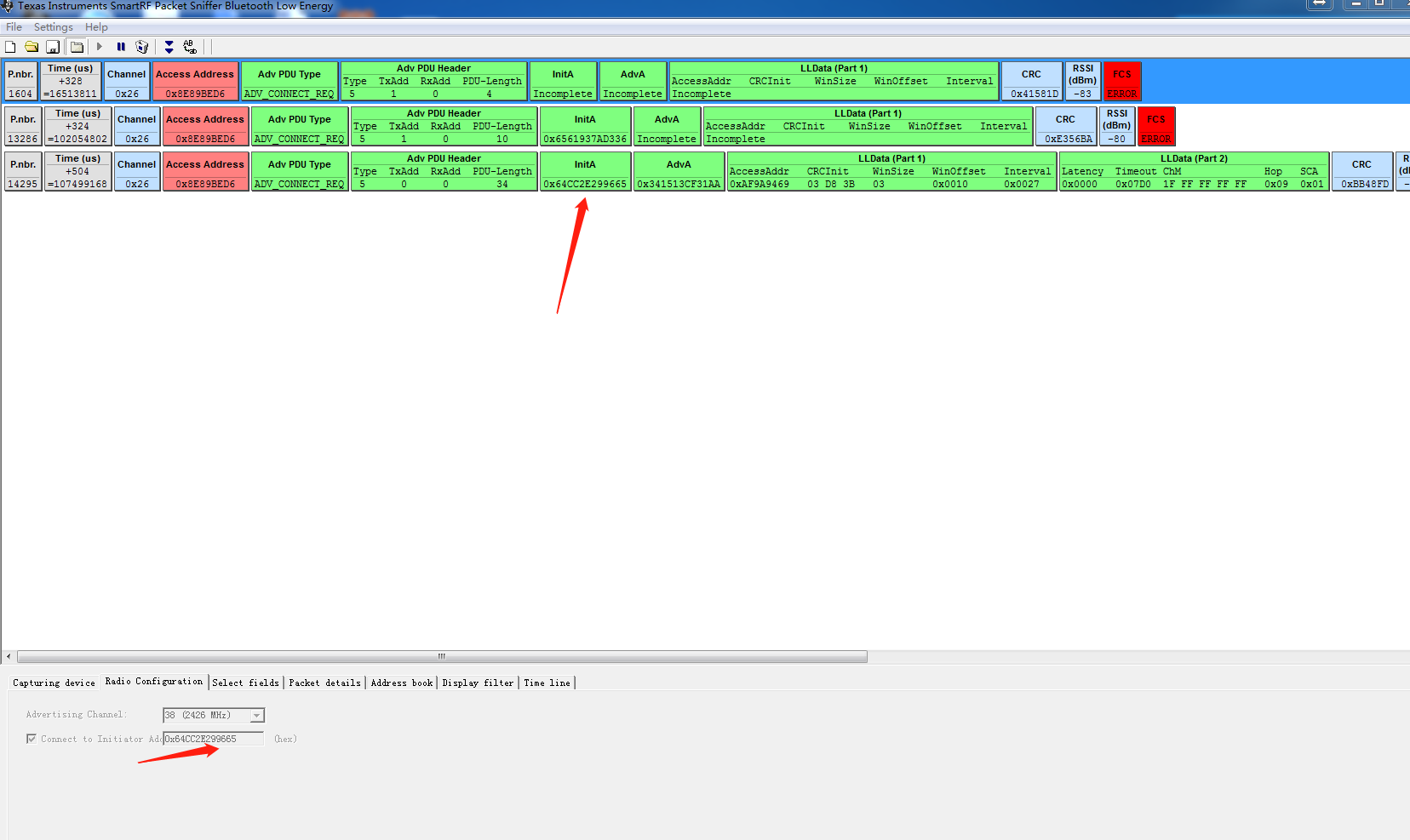 如果没有出现,说明没有捕捉到,因为蓝牙广播有3个通道,且是随机广播的,而usb dongle只能监听其中一个通道。具体参见文末链接不在详解。