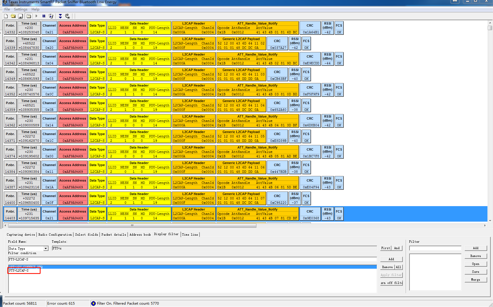 这时候在滤波中添加Data Type 为L2CAP-S,然后点击Apply filter 出现的就是纯数据了。