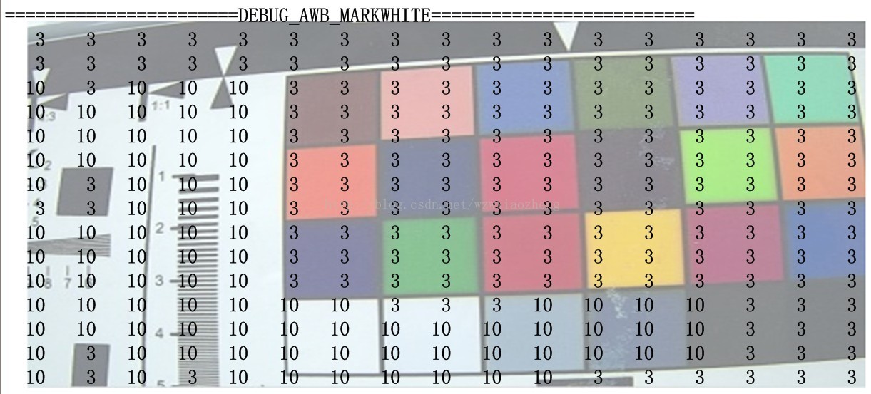 上面这个图中的数字标示出了检测到的白色区域,数字相同的表示一个白区,根据统计信息(白点数,rg/bg值)来区分的.可以看到有误判的地方,比如色卡左上第二块的肤色块.还有最右边从上面数第二块也是容易被判断成低色温白块的情况. 针对这种误判的情况,对不同块根据统计信息进行权重设置,以求让误判的区域对最终结果影响小一些.